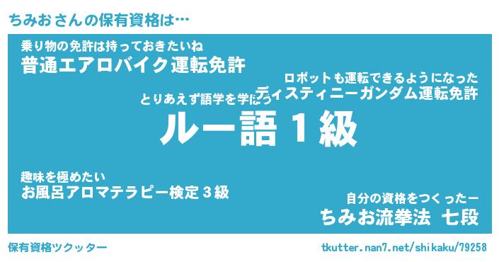 ちみおさんの保有資格は… とりあえず語学を学ぼう『 ルー語1級』乗り物の免許は持っておきたいね『普通エアロバイク運転免許』自分の資格をつくったー『ちみお流拳法 七段』 ツクッター #保有資格ツクッター http://tkutter.nan7.net/shikaku/79258/