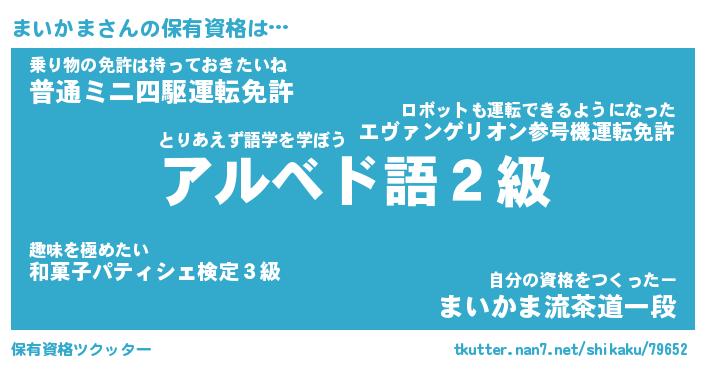 まいかまさんの保有資格は… とりあえず語学を学ぼう『アルベド語2級』乗り物の免許は持っておきたいね『普通ミニ四駆運転免許』自分の資格をつくったー『まいかま流茶道一段』 ツクッター #保有資格ツクッター http://tkutter.nan7.net/shikaku/79652/