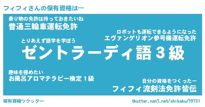 フィフィさんの保有資格は… とりあえず語学を学ぼう『ゼントラーディ語3級』乗り物の免許は持っておきたいね『普通三輪車運転免許』自分の資格をつくったー『フィフィ流剣法免許皆伝』 ツクッター #保有資格ツクッター http://tkutter.nan7.net/shikaku/79731/