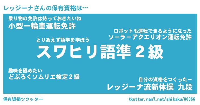 レッジーナさんの保有資格は… とりあえず語学を学ぼう『スワヒリ語準2級』乗り物の免許は持っておきたいね『小型一輪車運転免許』自分の資格をつくったー『レッジーナ流新体操 九段』 ツクッター #保有資格ツクッター http://tkutter.nan7.net/shikaku/80366/