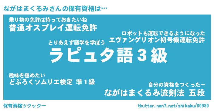 ながはまくるみさんの保有資格は… とりあえず語学を学ぼう『ラピュタ語3級』乗り物の免許は持っておきたいね『普通オスプレイ運転免許』自分の資格をつくったー『ながはまくるみ流剣法 五段』 ツクッター #保有資格ツクッター http://tkutter.nan7.net/shikaku/80980/
