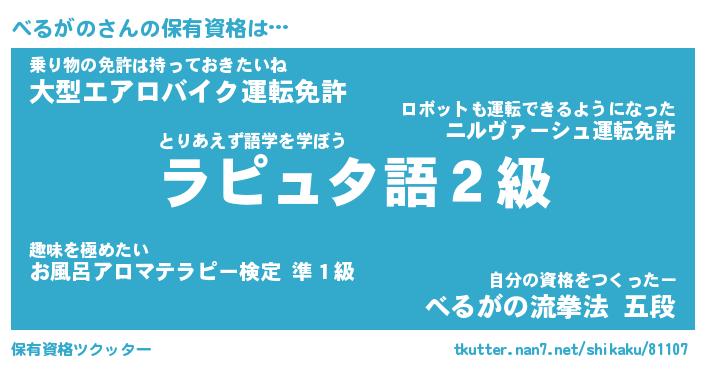 べるがのさんの保有資格は… とりあえず語学を学ぼう『ラピュタ語2級』乗り物の免許は持っておきたいね『大型エアロバイク運転免許』自分の資格をつくったー『べるがの流拳法 五段』 ツクッター #保有資格ツクッター http://tkutter.nan7.net/shikaku/81107/