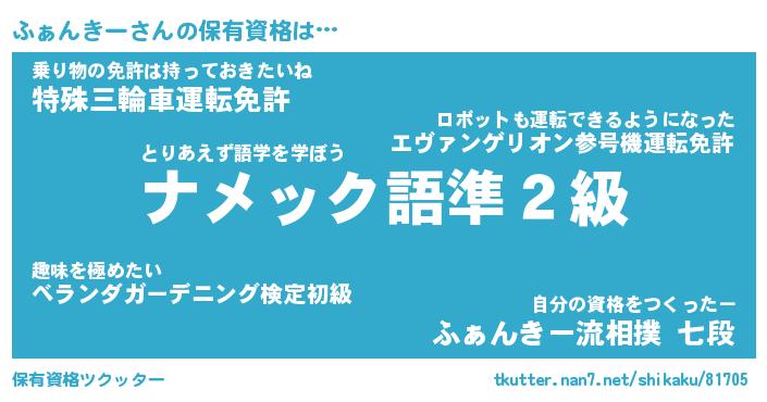 ふぁんきーさんの保有資格は… とりあえず語学を学ぼう『ナメック語準2級』乗り物の免許は持っておきたいね『特殊三輪車運転免許』自分の資格をつくったー『ふぁんきー流相撲 七段』 ツクッター #保有資格ツクッター http://tkutter.nan7.net/shikaku/81705/