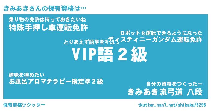 きみあきさんの保有資格は… とりあえず語学を学ぼう『 VIP語2級』乗り物の免許は持っておきたいね『特殊手押し車運転免許』自分の資格をつくったー『きみあき流弓道 八段』 ツクッター #保有資格ツクッター http://tkutter.nan7.net/shikaku/8298/
