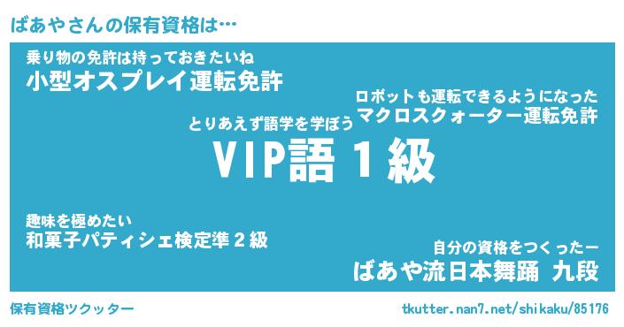ばあやさんの保有資格は… とりあえず語学を学ぼう『 VIP語1級』乗り物の免許は持っておきたいね『小型オスプレイ運転免許』自分の資格をつくったー『ばあや流日本舞踊 九段』 ツクッター #保有資格ツクッター http://tkutter.nan7.net/shikaku/85176/