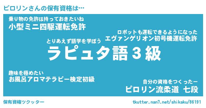 ピロリンさんの保有資格は… とりあえず語学を学ぼう『ラピュタ語3級』乗り物の免許は持っておきたいね『小型ミニ四駆運転免許』自分の資格をつくったー『ピロリン流柔道 七段』 ツクッター #保有資格ツクッター http://tkutter.nan7.net/shikaku/86191/