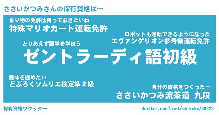 ささいかつみさんの保有資格は… とりあえず語学を学ぼう『ゼントラーディ語初級』乗り物の免許は持っておきたいね『特殊マリオカート運転免許』自分の資格をつくったー『ささいかつみ流茶道 九段』 ツクッター #保有資格ツクッター http://tkutter.nan7.net/shikaku/88928/