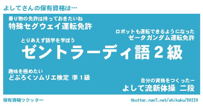 よしてさんの保有資格は… とりあえず語学を学ぼう『ゼントラーディ語2級』乗り物の免許は持っておきたいね『特殊セグウェイ運転免許』自分の資格をつくったー『よして流新体操 二段』 ツクッター #保有資格ツクッター http://tkutter.nan7.net/shikaku/90220/