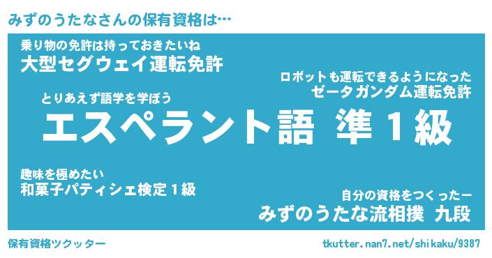 みずのうたなさんの保有資格は… とりあえず語学を学ぼう『エスペラント語 準1級』乗り物の免許は持っておきたいね『大型セグウェイ運転免許』自分の資格をつくったー『みずのうたな流相撲 九段』 ツクッター #保有資格ツクッター http://tkutter.nan7.net/shikaku/9387/