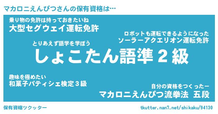 マカロニえんぴつさんの保有資格は… とりあえず語学を学ぼう『しょこたん語準2級』乗り物の免許は持っておきたいね『大型セグウェイ運転免許』自分の資格をつくったー『マカロニえんぴつ流拳法 五段』 ツクッター #保有資格ツクッター http://tkutter.nan7.net/shikaku/94130/