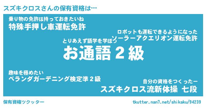スズキクロスさんの保有資格は… とりあえず語学を学ぼう『お通語2級』乗り物の免許は持っておきたいね『特殊手押し車運転免許』自分の資格をつくったー『スズキクロス流新体操 七段』 ツクッター #保有資格ツクッター http://tkutter.nan7.net/shikaku/94239/