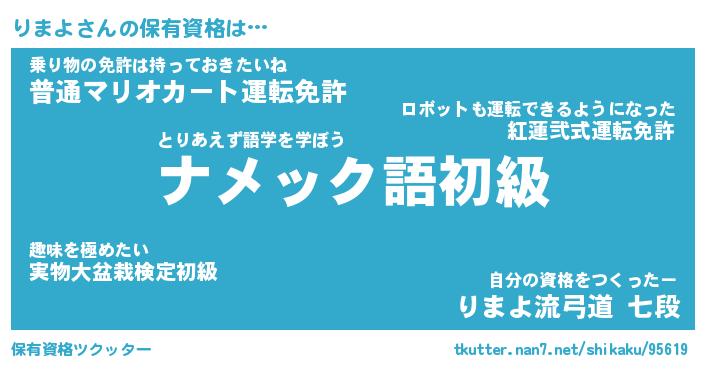 りまよさんの保有資格は… とりあえず語学を学ぼう『ナメック語初級』乗り物の免許は持っておきたいね『普通マリオカート運転免許』自分の資格をつくったー『りまよ流弓道 七段』 ツクッター #保有資格ツクッター http://tkutter.nan7.net/shikaku/95619/
