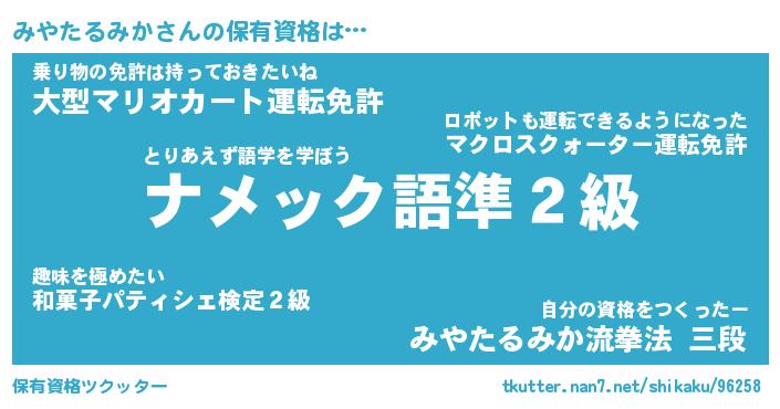 | 伝説のあだ名 | 『不死鳥のスナイパーみやたるみか』 |
