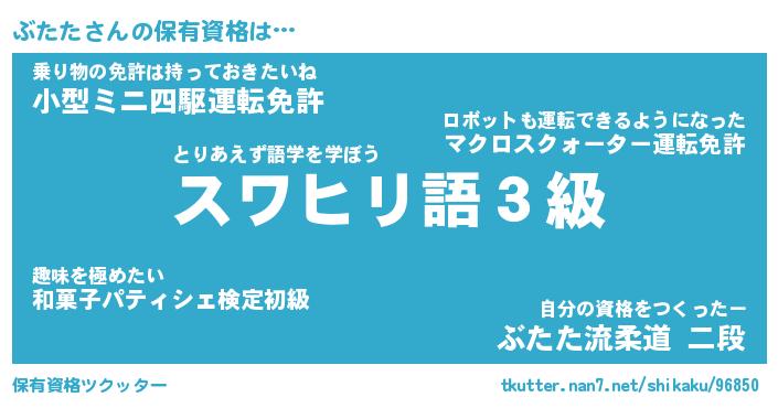 ぶたたさんの保有資格は… とりあえず語学を学ぼう『スワヒリ語3級』乗り物の免許は持っておきたいね『小型ミニ四駆運転免許』自分の資格をつくったー『ぶたた流柔道 二段』 ツクッター #保有資格ツクッター http://tkutter.nan7.net/shikaku/96850/