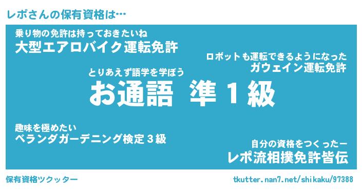 レポさんの保有資格は… とりあえず語学を学ぼう『お通語 準1級』乗り物の免許は持っておきたいね『大型エアロバイク運転免許』自分の資格をつくったー『レポ流相撲免許皆伝』 ツクッター #保有資格ツクッター http://tkutter.nan7.net/shikaku/97388/