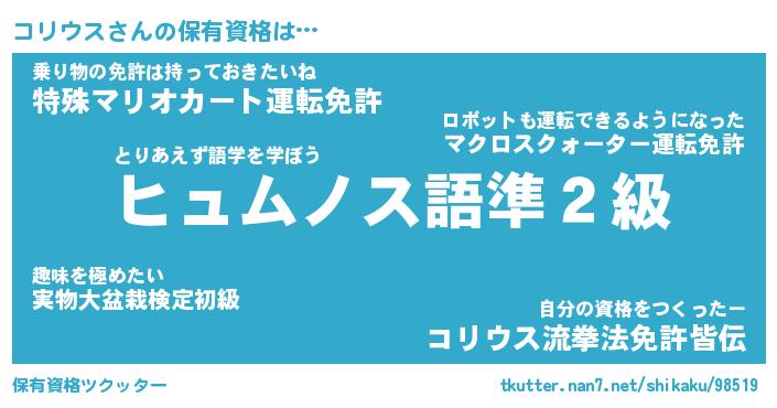 | ヒーロー風カッコイイあだ名 | 『スーパーコリウス』『暗黒騎士コリ』 |