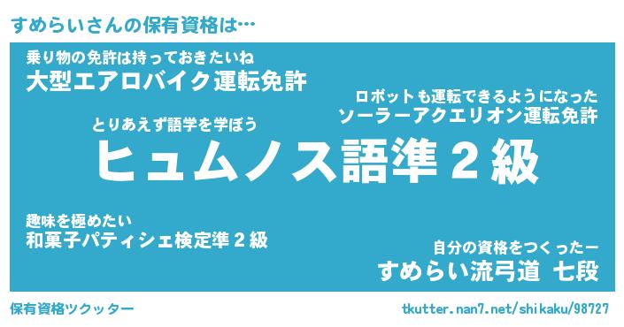 すめらいさんの保有資格は… とりあえず語学を学ぼう『ヒュムノス語準2級』乗り物の免許は持っておきたいね『大型エアロバイク運転免許』自分の資格をつくったー『すめらい流弓道 七段』 ツクッター #保有資格ツクッター http://tkutter.nan7.net/shikaku/98727/