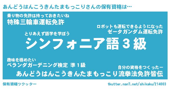 あんどうはんこうきんたまもっこりさんの保有資格は… とりあえず語学を学ぼう『シンフォニア語3級』乗り物の免許は持っておきたいね『特殊三輪車運転免許』自分の資格をつくったー『あんどうはんこうきんたまもっこり流拳法免許皆伝』 ツクッター #保有資格ツクッター http://tkutter.nan7.net/shikaku/214003/