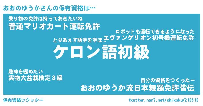 おおのゆうかさんの保有資格は… とりあえず語学を学ぼう『ケロン語初級』乗り物の免許は持っておきたいね『普通マリオカート運転免許』自分の資格をつくったー『おおのゆうか流日本舞踊免許皆伝』 ツクッター #保有資格ツクッター http://tkutter.nan7.net/shikaku/213813/