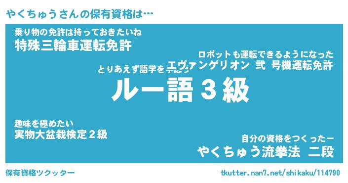 やくちゅうさんの保有資格は… とりあえず語学を学ぼう『 ルー語3級』乗り物の免許は持っておきたいね『特殊三輪車運転免許』自分の資格をつくったー『やくちゅう流拳法 二段』 ツクッター #保有資格ツクッター http://tkutter.nan7.net/shikaku/114790/