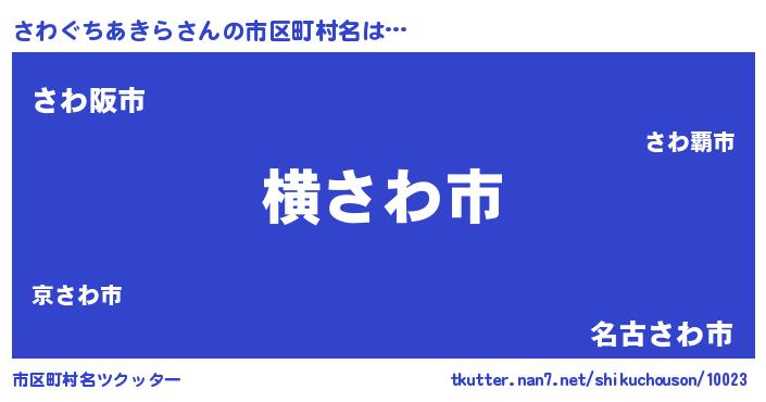 さわぐちあきらさんの市区町村名は… 『横さわ市』『さわ阪市』『名古さわ市』 ツクッター #市区町村名ツクッター http://tkutter.nan7.net/shikuchouson/10023/