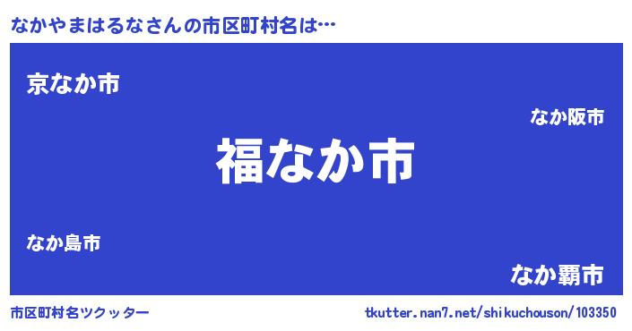なかやまはるなさんの市区町村名は… 『福なか市』『京なか市』『なか覇市』 ツクッター #市区町村名ツクッター http://tkutter.nan7.net/shikuchouson/103350/