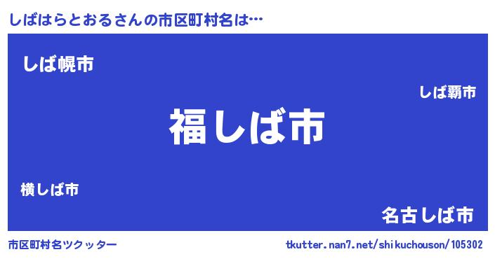 しばはらとおるさんの市区町村名は… 『福しば市』『しば幌市』『名古しば市』 ツクッター #市区町村名ツクッター http://tkutter.nan7.net/shikuchouson/105302/