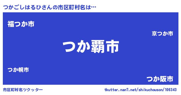 つかごしはるひさんの市区町村名は… 『つか覇市』『福つか市』『つか阪市』 ツクッター #市区町村名ツクッター http://tkutter.nan7.net/shikuchouson/106343/