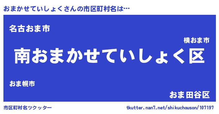 おまかせていしょくさんの市区町村名は… 『南おまかせていしょく区』『名古おま市』『おま田谷区』 ツクッター #市区町村名ツクッター http://tkutter.nan7.net/shikuchouson/107197/