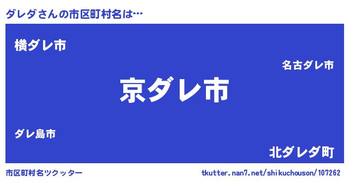 ダレダさんの市区町村名は… 『京ダレ市』『横ダレ市』『北ダレダ町』 ツクッター #市区町村名ツクッター http://tkutter.nan7.net/shikuchouson/107262/