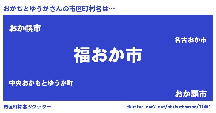 おかもとゆうかさんの市区町村名は… 『福おか市』『おか幌市』『おか覇市』 ツクッター #市区町村名ツクッター http://tkutter.nan7.net/shikuchouson/11461/