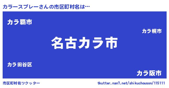 カラースプレーさんの市区町村名は… 『名古カラ市』『カラ覇市』『カラ阪市』 ツクッター #市区町村名ツクッター http://tkutter.nan7.net/shikuchouson/115111/