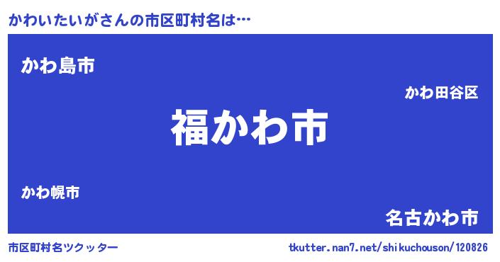 かわいたいがさんの市区町村名は… 『福かわ市』『かわ島市』『名古かわ市』 ツクッター #市区町村名ツクッター http://tkutter.nan7.net/shikuchouson/120826/