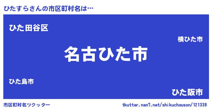 ひたすらさんの市区町村名は… 『名古ひた市』『ひた田谷区』『ひた阪市』 ツクッター #市区町村名ツクッター http://tkutter.nan7.net/shikuchouson/121338/