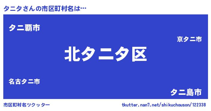 タニタさんの市区町村名は… 『北タニタ区』『タニ覇市』『タニ島市』 ツクッター #市区町村名ツクッター http://tkutter.nan7.net/shikuchouson/122338/