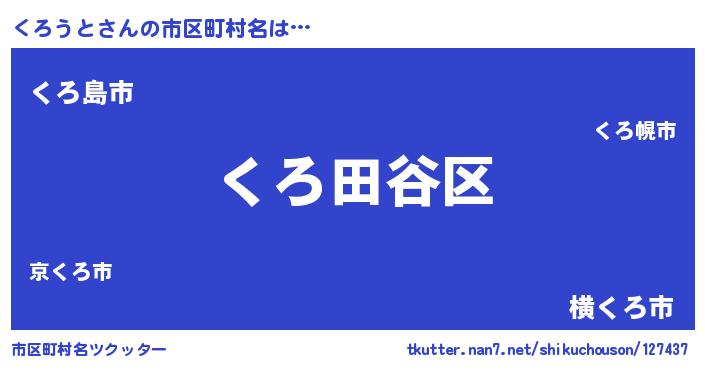 くろうとさんの市区町村名は… 『くろ田谷区』『くろ島市』『横くろ市』 ツクッター #市区町村名ツクッター http://tkutter.nan7.net/shikuchouson/127437/