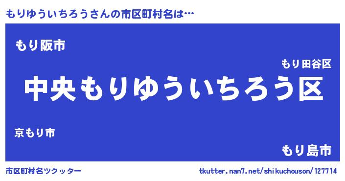 もりゆういちろうさんの市区町村名は… 『中央もりゆういちろう区』『もり阪市』『もり島市』 ツクッター #市区町村名ツクッター http://tkutter.nan7.net/shikuchouson/127714/