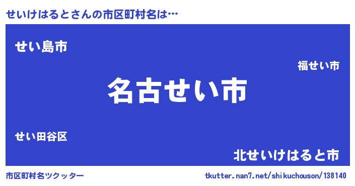 せいけはるとさんの市区町村名は… 『名古せい市』『せい島市』『北せいけはると市』 ツクッター #市区町村名ツクッター http://tkutter.nan7.net/shikuchouson/138140/