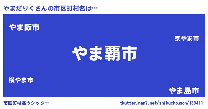 やまだりくさんの市区町村名は… 『やま覇市』『やま阪市』『やま島市』 ツクッター #市区町村名ツクッター http://tkutter.nan7.net/shikuchouson/139411/
