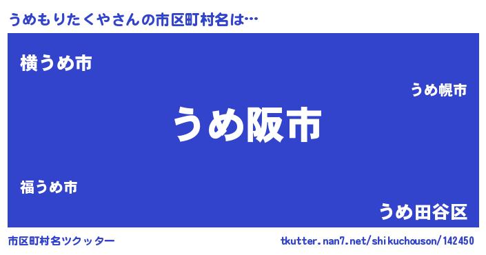 | 男性向けラノベタイトル風あだ名 | 『うめもりたくやの嫁は女の子じゃないと思った?』 |