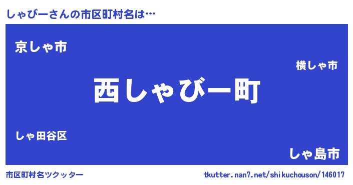 しゃびーさんの市区町村名は… 『西しゃびー町』『京しゃ市』『しゃ島市』 ツクッター #市区町村名ツクッター http://tkutter.nan7.net/shikuchouson/146017/
