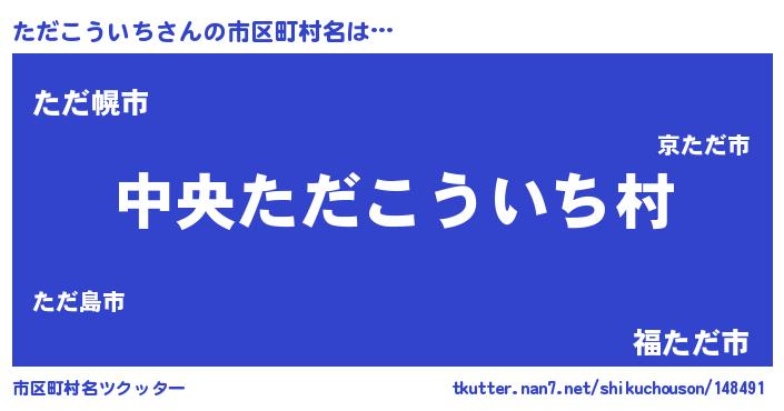 ただこういちさんの市区町村名は… 『中央ただこういち村』『ただ幌市』『福ただ市』 ツクッター #市区町村名ツクッター http://tkutter.nan7.net/shikuchouson/148491/