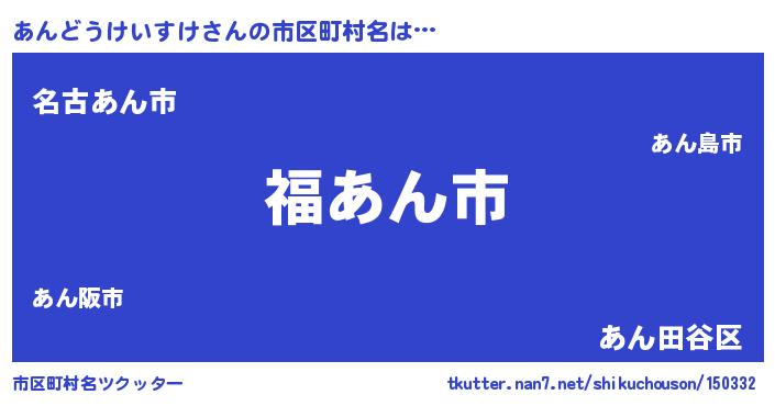 | 男性向けラノベタイトル風あだ名 | 『あんどうけいすけ~年齢イコール彼女いない歴の魔法使い~』 |