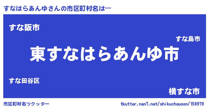 すなはらあんゆさんの市区町村名は… 『東すなはらあんゆ市』『すな阪市』『横すな市』 ツクッター #市区町村名ツクッター http://tkutter.nan7.net/shikuchouson/158979/