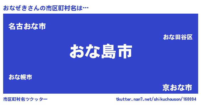 おなぜきさんの市区町村名は… 『おな島市』『名古おな市』『京おな市』 ツクッター #市区町村名ツクッター http://tkutter.nan7.net/shikuchouson/160094/