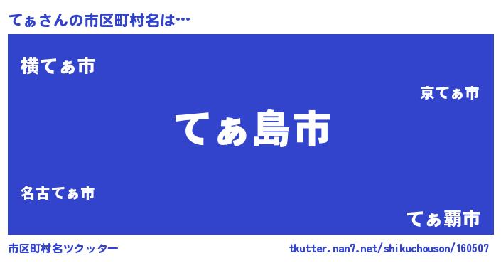 てぁさんの市区町村名は… 『てぁ島市』『横てぁ市』『てぁ覇市』 ツクッター #市区町村名ツクッター http://tkutter.nan7.net/shikuchouson/160507/