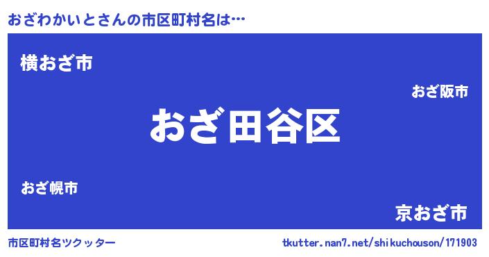 おざわかいとさんの市区町村名は… 『おざ田谷区』『横おざ市』『京おざ市』 ツクッター #市区町村名ツクッター http://tkutter.nan7.net/shikuchouson/171903/