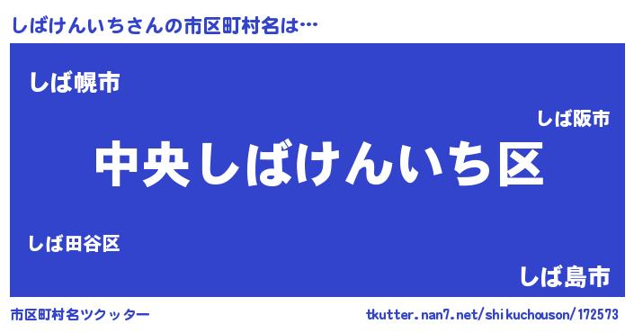 しばけんいちさんの市区町村名は… 『中央しばけんいち区』『しば幌市』『しば島市』 ツクッター #市区町村名ツクッター http://tkutter.nan7.net/shikuchouson/172573/