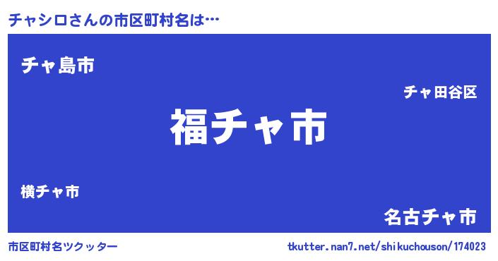 | 男性向けラノベタイトル風あだ名 | 『チャシロ~年齢イコール彼女いない歴の魔法使い~』 |