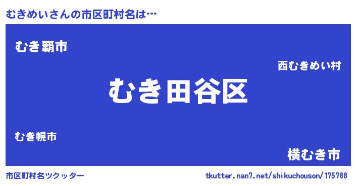 むきめいさんの市区町村名は… 『むき田谷区』『むき覇市』『横むき市』 ツクッター #市区町村名ツクッター http://tkutter.nan7.net/shikuchouson/175788/